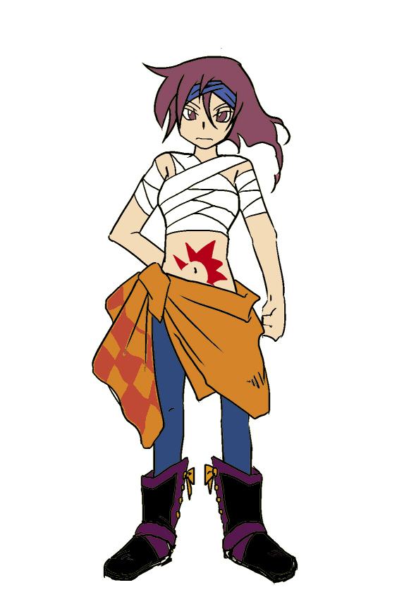 基本的にコイツ自体フリーダムなのでじゃらじゃらアクセが増えたりペイントが変わったりいろいろするんだよきっと。半目は初期から共通だよ。ブーツは後ろで結ぶタイプだよ。髪は毛先カールであずき色だよ上着は羽織ってたり腰に巻いてたりするよ腰巻きの下はホットパンツとかじゃないの?他はフリーダムだよもう。